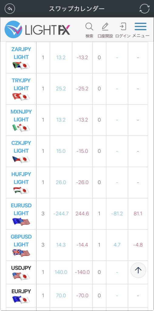 でも、実際にLIGHT FXのスワップカレンダーを見てHUFのスワップが26円/10万通貨と確認して、計算し直した。
